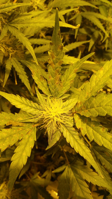 It seems that I took some shots of the possible CalMg defs on this day, some spotted leaves. And I took shots of some buds that were hit on day 55 - both are from the same CM I think. @hippy71 @RamboGarden could you have a look maybe? Just click on the pics and then you can zoom in. To me it looks like spots from CalMg def but maybe I'm just poisoning them with P or something