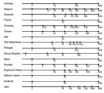 Particle size classifications used by different countries, diameters in μm