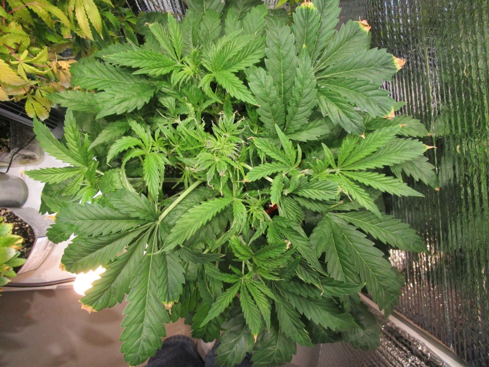 Day 35 - Not much vertical growth the last 5days. However, the leaves and lateral branching are continuing to grow, so I guess that means a bushier pheno of the DG is in store for me. You can see a lot of the burnt tip ends in the photos, so I decided to water-only (walmart filtered water ph'ed to 6.4) for the previous two waterings. I have gone to watering every two days. Day 31 I used 30 ounces and had a small bit of runoff. Today, I used 25 ounces with no runoff, so I went with another 10 ounces and had the slightest bit of runoff. So she is beginning to drink more. Plant looks better with just plain water instead of mammothP and Recharge+ in the water. I will continue this plain water until I see she needs a boost from either stretch or bud building. Starting to see a few preflowers, so things are happening.