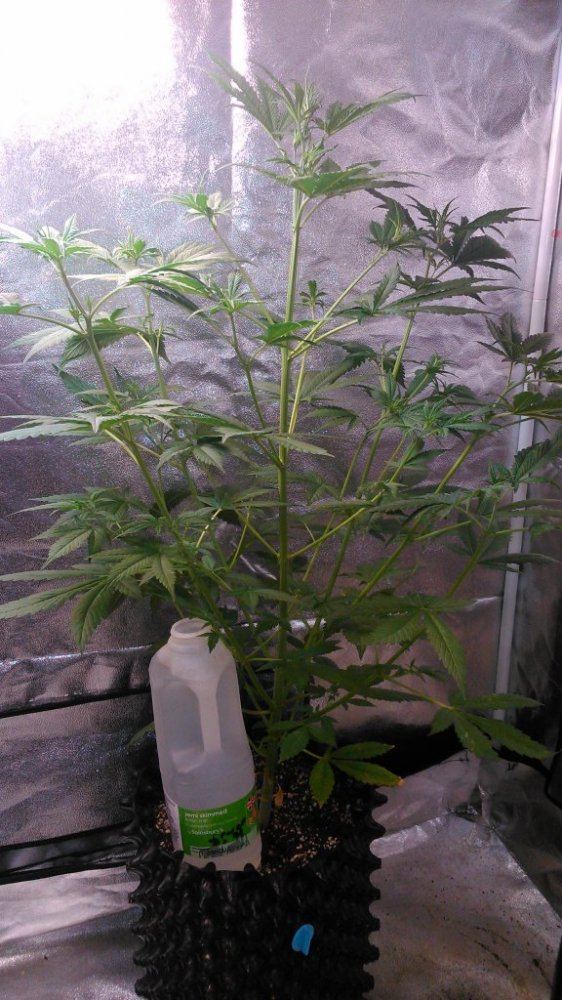 She is desperately trying to grow vertically but I'm not having any of it, the light is pretty much sat right on top of her. Until I get these side branches to raise up a little bit she's not going anywhere. Trying to control it before it gets out of hand, using CFL's I have to keep everything I wanna flower at pretty much an equal height else I'm left with staggered harvests which are just a pain in the ass.